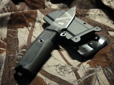 Ножны выполнены из ударопрочного полимера типа Kydex с многовариантным подвесом. Сейчас уже делают новый вариант ножен, с "закрытым" низом - но меня устраивает именно такой - вода стекает по лезвию и не задерживаясь в ножнах выходит наружу.