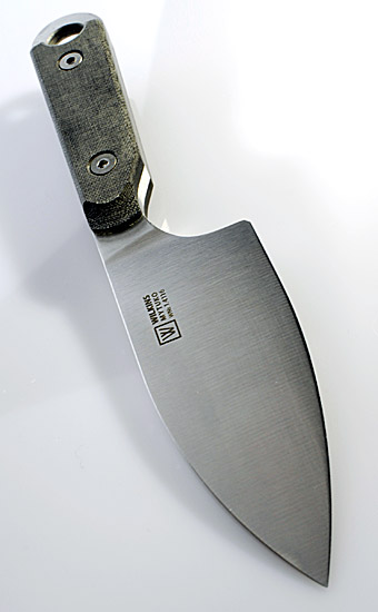 Jimping on the spine of the blade where the thumb rests and a large lanyard hole. Leather belt sheath for horizontal belt carry. Made in USA.