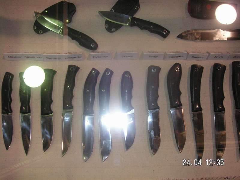 Здравствуйте Матвей. На весеннем Клинке, на сденде РВС, сделал пару фоток. Нож в разрезе видно плохо, но разглядеть можно. На фото РВС, он правый верхний, а на фото Снова РВС, он самый верхний.