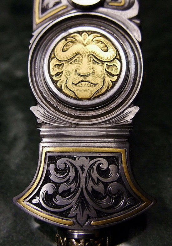 Рукоять ножа несет на себе элементы подсознательного восприятия. Перекрестье напоминает кельтский крест. Рукоятка монолитная. Штырь является же и осевым болтом, проходящим через рот Борея. На старинных морских картах направление ветров изображали в виде лица дующего ветер в какую-либо сторону. Грозность или мягкость взгляда определяла степень опасности. В центре стопорного рычага отпирающего эксцентриковый механизм изображен плачущий Христос. На старых картинах захоронение часто отображалось как надгробие с крестом, основание которого уходило в землю, в подземное царство, часть которого также была видна. В основании креста, обычно в круге, изображалась собака или Дьявол. Юбочная конфигурация задника рукоятки (skirt) была типичной формой старинных ножей дошедшая до наших дней. Она придает форме элемент сексуальности и удобна при хвате пальцами.