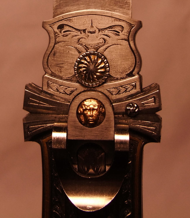 Нож имеет боковой выброс клинка. Работа выполнена в готическрм стиле. Много лет назад многие авториты из Нью-Йорка были заказчиками автора. Мастер обычно закладывает серию ножей из 7-8 штук опохожего дизайна и больше к нему не возвращается. Кольцо - это поинт-гард, символическая дань истории прошлого ножей. Он имел практический смысл. В средние века были развиты поединки на ХО и ножах. Клинки ножей и леворуких кинжалов зачастую снабжались кольцами рахнообразных видов и форм: одним, двумя, тремя и т.д.. Иногда в кольце была сетка. Кольцо не обязательно было круглой формы. Оно могло быть исполнено в виде ракушки со всевозможными зацепами, завитками, в которое могло попасть и застрять острие клинка противника. Человек, у которого клинок попал в такой захват терял секунды боя, чтобы высвободить оружие требовалось вытянуть его назад, а в это время противник наносил ему удар второй вооруженной рукой. Например на немецких леворуких кинжалах Caксонии были простые кольца прикрепленные к перекрестью кинжала. Гарды старинных шпаг и рапир также зачастую имели всевозможные формы с отверстиями в виде дырочек, проререзей, крестиков, имели зацепы. Подобный элемент оружия производил эффект и психологического устрашения на противника своим необычным внешним видом, хотя как основной фактор победы в бою не решал. В данном ноже поинт-гард открывается автоматически на 90 градусов, под воздействием пружины клинок выбрасывается вперед. Небольшая выемка на задней части клинка освобождает пин с грибовидной шляпкой, а пружина откидывает поинт-гард в вертикальное положение. Откидывающийся поинт-гард изобретение мастера. До него никто не делал откидывающийся поинт-гард. Скорость выброса лезвия регулируется бегунком расположенным на ребре рукоятки. При сдвижении его вперед или назад, возможно увеличение или уменьшение скорости выброса клинка. Оружие и искусство неразрывно были связаны друг с другом с момента зарождения орудий труда. Изначально на почве верований. Издревна люди старались украсить отличительным орнаментом или рисунком, орудие охоты, ч тобы оно принесло им удачу, заговор ить его символом, и тем самым получить отличие от простого аналога. Можно сказать, что в определенном смысле искусство развивалось и способствовало развитию оружия. Данный нож – обоюдоострый стилет не является боевым оружием и не предназначен для поединков. Это историческая реплика выполненная, как произведение искусства.