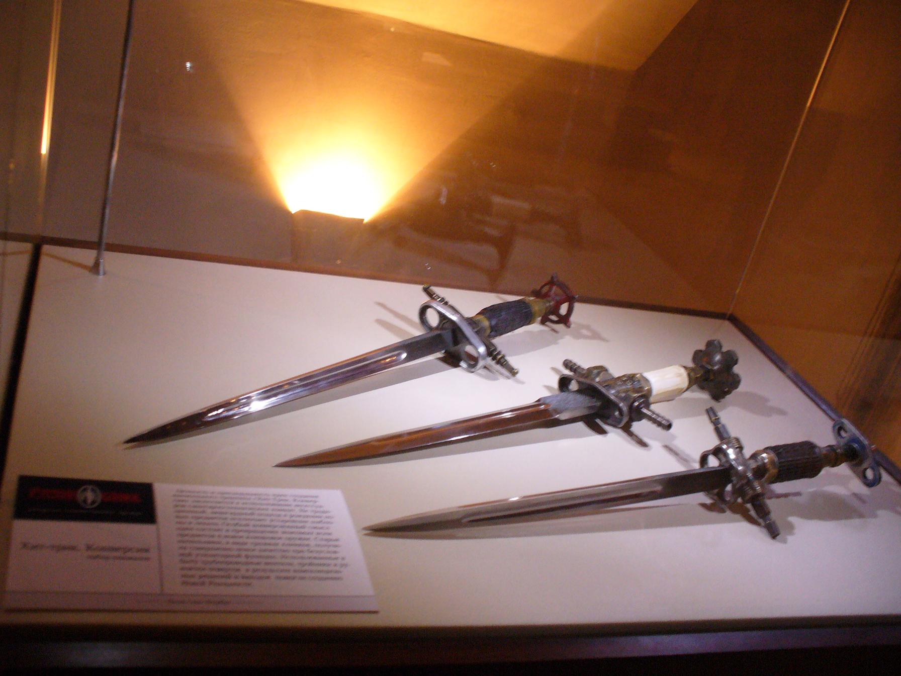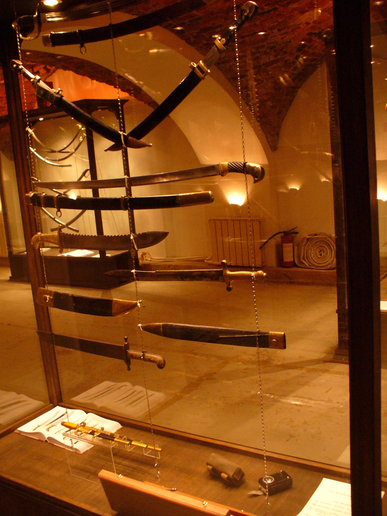 С-Пб,Конюшенная пл.д.1, коию сегодня и посешал. В здании цокольного этажа, располагается коллекция клинкового оружия, в ней представлены - мечи, шпаги ,сабли, палаши, топоры, кинжалы и ножи, разных времён и народов. Также присутствует тренировочный стенд для метания ножей.
