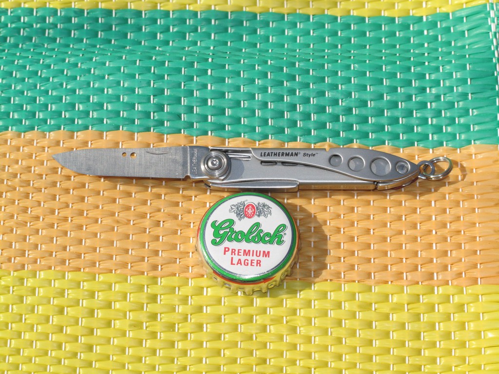В процессе фотографирования и осмотра я всё думал что ещё вам написать, попутно не забывал о солнечных ваннах и другой моей страсти - пиве. На этот раз меня сопровождал Grolsch калужского розлива. Бутылки имеют откручивающуюся крышку, но я всё же придумал как применить свой минитул по назначению. На вид совсем невзрачная открывашечка справилась со своей задачей без затруднений, только вот из-за размера пришлось произвести два захвата крючком.