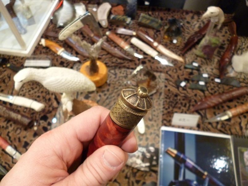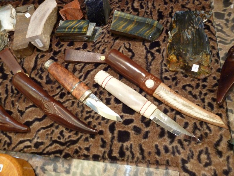 Небольшой хол, столы, всё достаточно по басяцки. Все говорять по фински и английски, иногда ещё и по шведски. По русски и немецки не говорят. Короче, было трудно. Начал обход с права на лево по внешнему кругу. Происходило всё примерно так: я смотрел, потом жестами спрашивал, можно ли в руки взять, затем, можно ли сфотографировать? Мастера всё разрешали и я этим пользовался. На последок брал визитку и прощался. В итоге у меня накопилось куча визиток.