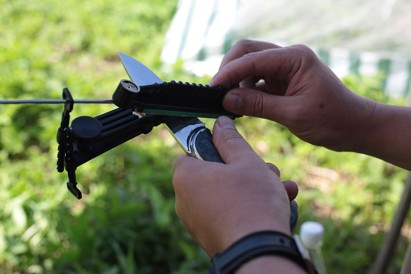4. Заточка ножей на точилке DMT на одинаковый угол (ок. 24 гр.), тремя камнями – 325, 600 и 1200 грит до примерно одинаковой остроты – бритья волос на предплечье.