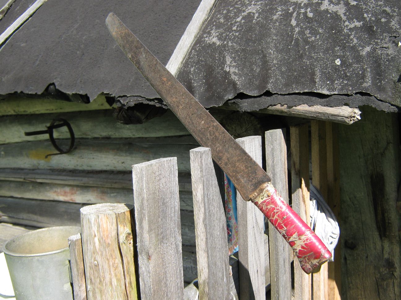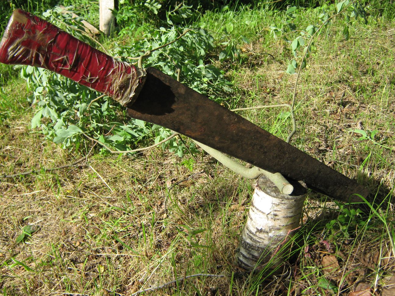 Решил написать не много про самый пользуемый мною в деревне инструмент. В общем-то я не знаю, что это, но это было потеряно дорожниками. Как то давно, лет этак ...дцать назад, чистили они канавы и забыли его. С тех пор он служит нам, верой и правдой, первый помощник при рубке, расчистке, дрова, ветки -все ему по плечу! Почти уверен, что сделан он из полотна пилы и видимо с какой то промышленной. Хорошо держит заточку, не скалывается, а заминается на твердом, но очень не охотно. Ржавеет тоже с трудом: полотно потемнело давно, а вот РК за зиму лежания без дела только местами имеет рыжеватые пятна, да и те быстро выводятся при заточке. Единственный спорный момент в сём изделии - это рукоять. Вроде и удобная, но великовата для меня. Монтаж накладной, фиксация проволокой и изолентой. В общем-то незамысловатый инструмент, как и работа им выполняемая!