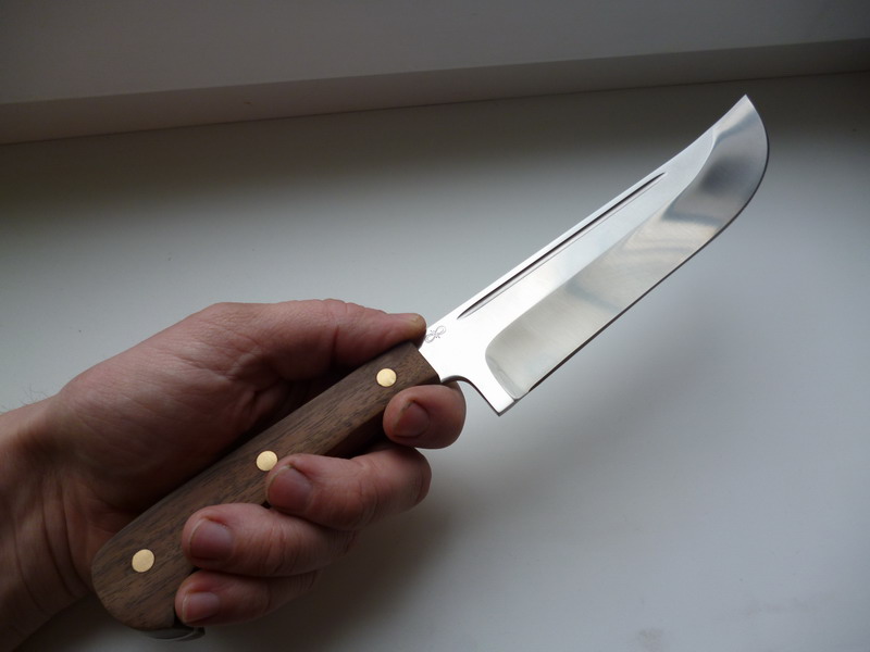 ОНО и стало прототипом моего ножа. За счёт небольшой кривизны клинка решился вопрос его трения об разделочную доску. На прямоклинковых ножах при нарезке скажем моркови, редиса или небольших пучков зелени соприкосновение РК с разрезаемым продуктом в среднем 2-3см остальная част в холостую режет разделочную доску, что даёт не нужное сопротивление и как следствие затупление РК. На моём коренчатом этого не происходит. Сталь 95Х18, за углеродкой нужен больший уход, чего супруга делать не привыкла. :( С формой рукояти особо не заморачивался, нагло спёр у Анатолича26 думаю простит. МАСТЕР он уважаемый и весьма толковый, по этому вряд ли стал ставить не кузявые рукояти на свои изделия.