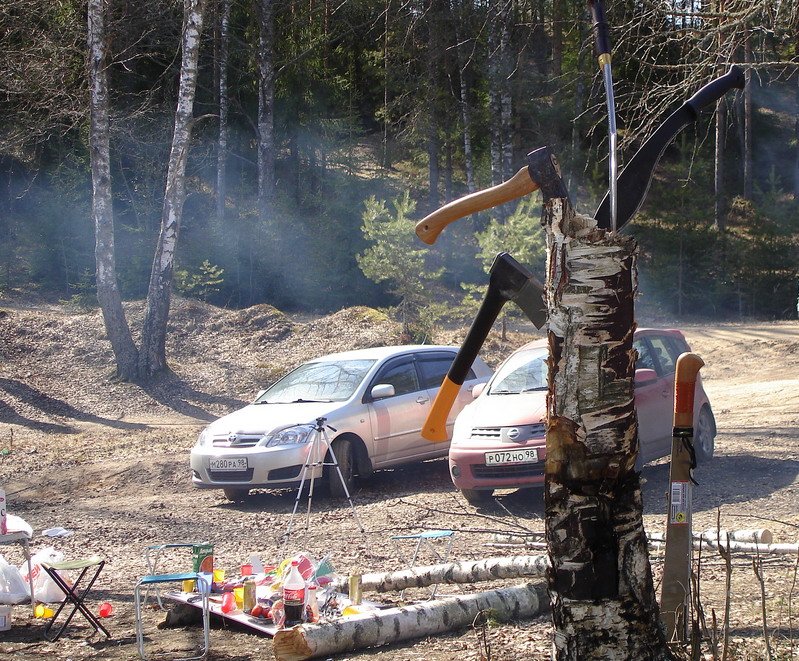 Ну да, наверно кхукри хорош летом ивняк порубать, да - согласен. С топором так не получится. А если взять работу по дереву. Ну то есть диаметром - человеческое запястье и больше? А для костра дровишек? А если основательный шалашик? А если забить колышки? А берем "мокрую" пору - весну/осень и мокрую древесину? А зиму и промерзшую древесину? Неее... Извините, но при сравнении с топором в наших условия кхукри - нервно курит в стороне :)