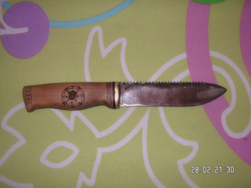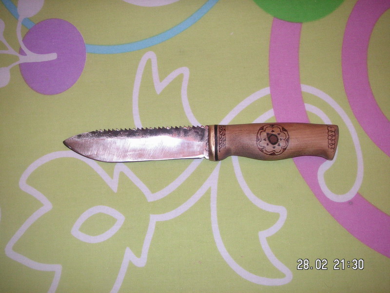 Получился у тебя действительно рабочий ножик. Мощный, без претензий. Такой не жалко испоганить нечаянно и клинок ненароком обломать. А то, что пилу на обухе оставил - прикольно :) Рэмбо бы оценил :D Не уверен, что обухом пилить что-то будет удобно: зубья мелкие и широкие - для металла. Впрочем, черенок у лопаты отполовинить можно :D