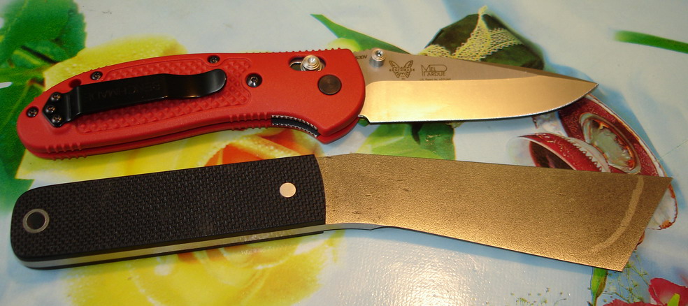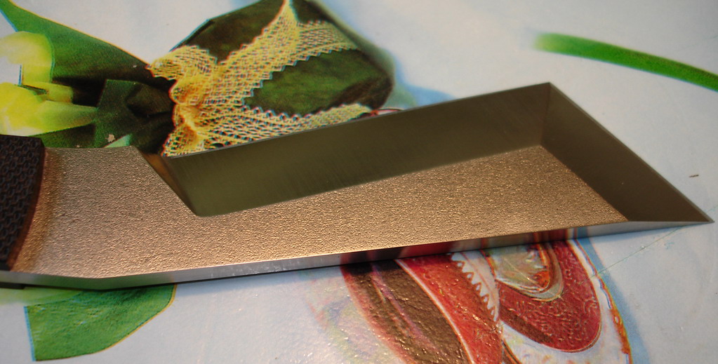 Я так понимаю, что он под левшу заточен. Отсюда неудобство с нарезкой. Вообще с таким углом и односторонней заточкой он должен очччень тоненько резать. Прикольный девайс. Техно-кукри. :lol: