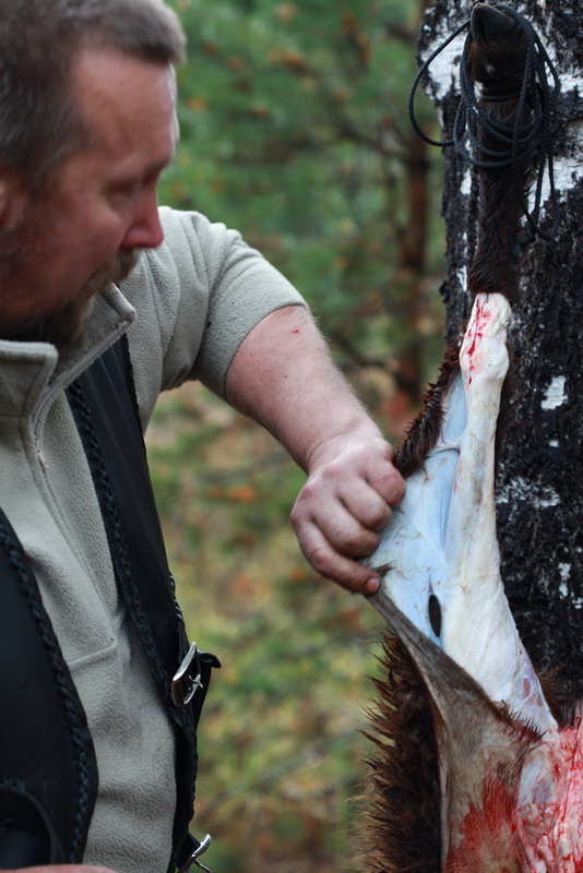 Далее, для удобства разделки, тушу подвесили на паракорде за задние лапы и начался процесс свежевания (снятия шкуры). Перед непосредственным снятием шкуры надо сделать кольцевые надрезы на ногах в районе коленного сустава. Операция для ножа не простая, ведь фактически шкура разрезается на костях и сухожилиях. Нож справился с этим достойно, без повреждений РК.