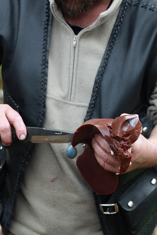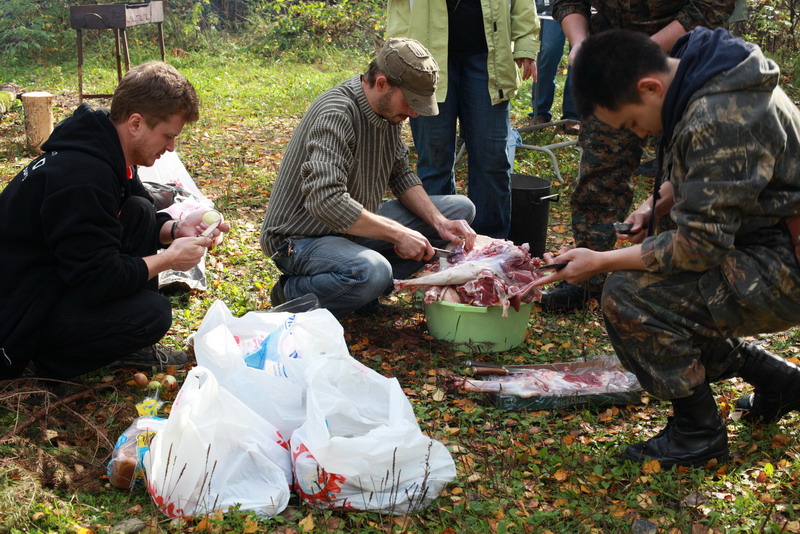 В роли убитого животного выступал курдючный барашек, которого забил и разделал очень опытный охотник, знаток леса и мастер разделки Дмитрий.