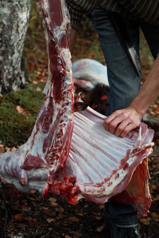 После того, как вынули внутренности и отделили конечности от туши. Настало время серьезного испытания для ножа. Надо было срезать ребра с позвоночника. Делается это очень просто — левой рукой хватаемся за сами ребра, оттягиваем их чуть в сторону, в это же время правой рукой, резким движением от себя вниз, разрезаем ребра ножом. Рокстедом это делать было не удобно. И причин тут много: