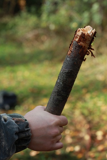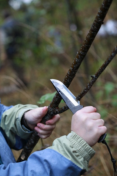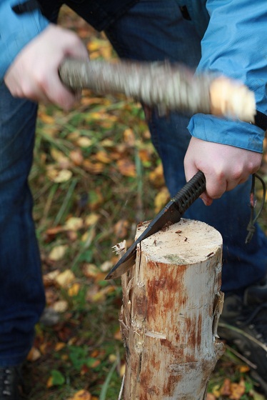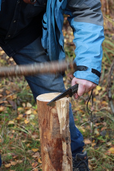 Для розжига костра наш охотник нащепил ножом пару полешек. Для батонинга нож оказался достаточно удобным, но излишняя толщина клинка все же немного мешала – нож слегка подклинивало и для откола щепы приходилось прилагать больше усилий, чем немного более тонким ножом.