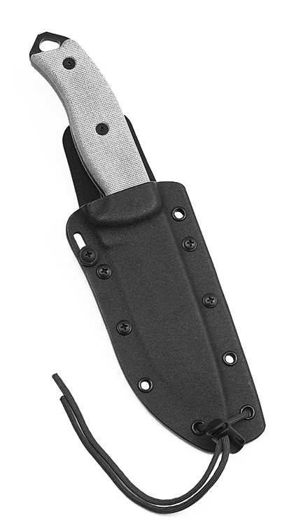 Ножны из кайдекса, крепление - пистолетная клипса. Фиксируется нож в ножнах прижимным роликом, очень надёжно!
