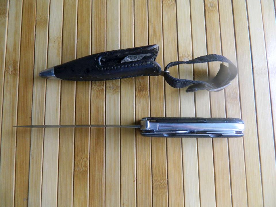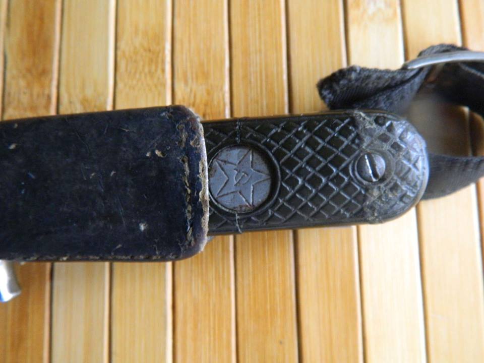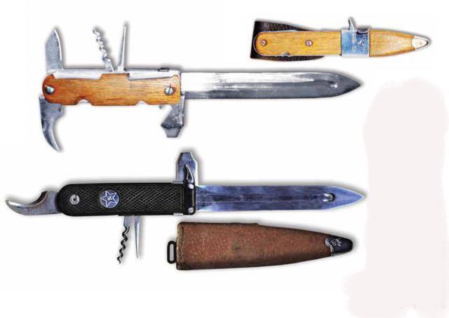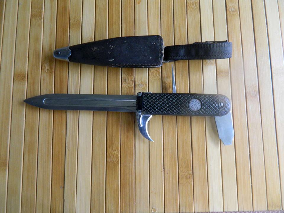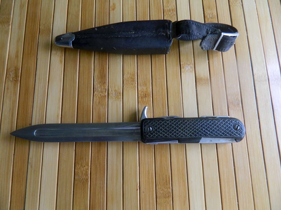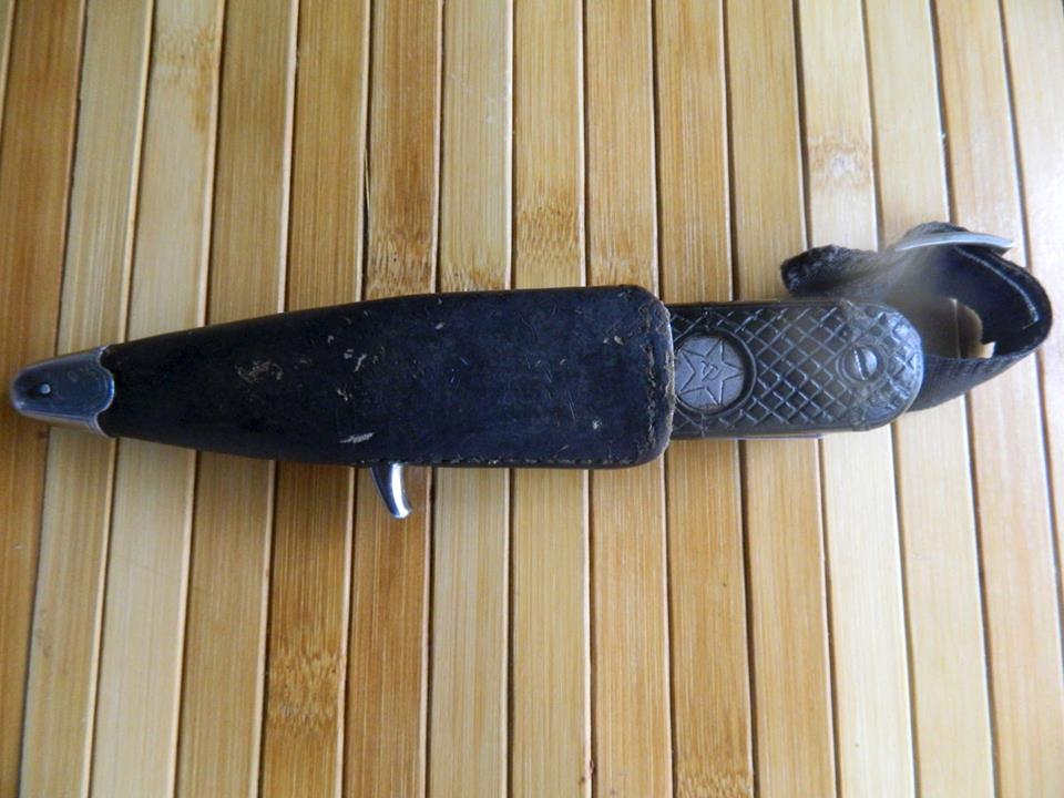 В нижней части рукояти расположен металли­ческий прилив-упор. На рукояти с обеих сторон две рифленые на­кладки из темно-зеленого пластика или дерева. Кроме основного клинка, в ноже имеются: отвертка, консервный нож, шило и штопор. Нож­ны ножа короткие, с металлическим наконечником, на котором изображены серп и молот.