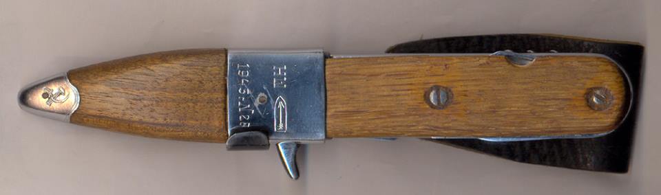 Нож офицерский образца 1945 года (нож Шилина). СССР. Экспериментальный. Двулезвийный клинок ножа, убиравшийся на две трети в руко­ять, в выдвинутом состоянии удерживался пружинным фиксато­ром, вмонтированным в рукоять. Клинок с одним долом по сред­ней линии на обеих сторонах, заканчивающимся у острия цилинд­рическим углублением. За углубления клинок удерживается пружиной в ножнах при извлечении ножа, позволяя вытянуть клинок из рукояти.