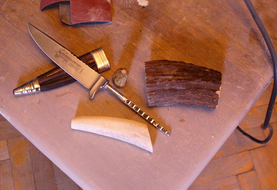 Вот что получилось..ТТХ Клинок золинген,сталь 440с, рукоять рог (не лось не олень, как выясняется на ганзе, вобщем так и не пришли к одназначному решению,что за рог) и тыльник буйвола, проставки латунь и немного пинов из трубочек залит колерованным суперхватом., клинок 100х20х6+квостовик85, общая длинна 205.монтаж на суперхват, в тыльнике доп штифт из титана.