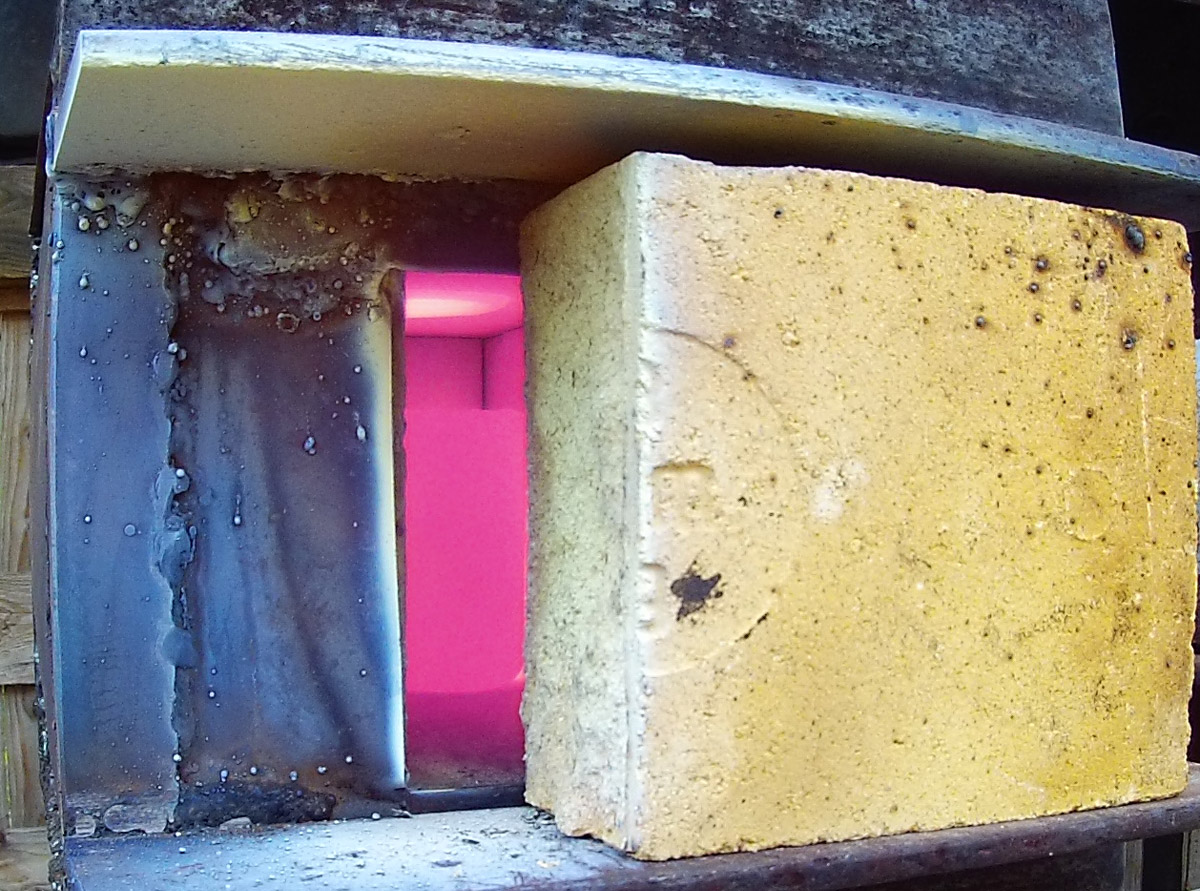 Немного доделал окно горна, приварил козырёк и полку, для задвижки окна кирпичём, ну и попробовал макумку сварить из отходов цветмета (бронза +гвозди) одну вскрыл, вроде ничего так получилась.