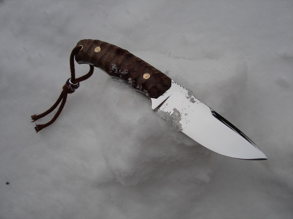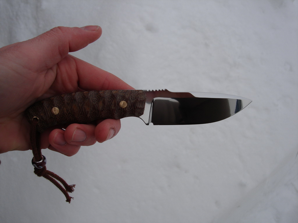 Андрей по впадинам наверное отчасти соглашусь... тут смотри какая фигня..."в начале было слово"(с), точнее рисунок и шаблон из пластика который долго и упорно подгонялся под руку и был в конце-концов (в 7-м или 8-м варианте) признан удобным, клинок сделан в тютельку по шаблону. А вот насечки на рукояти в следующий раз надо будет делать помельче, тогда они своим видом не будут "затенять" подпальцевые выемки. Вот фотка профиля рукояти.