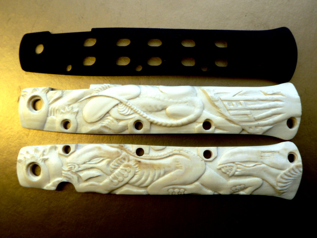 Делал хорошему человеку накладки на Ти лайт, нож ушёл, а пластмассовые щёчки остались. По ним вырезал из мамонта ужасти. Вот так и лежат, без клинка и без хозяина.
