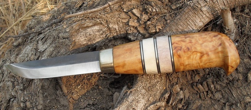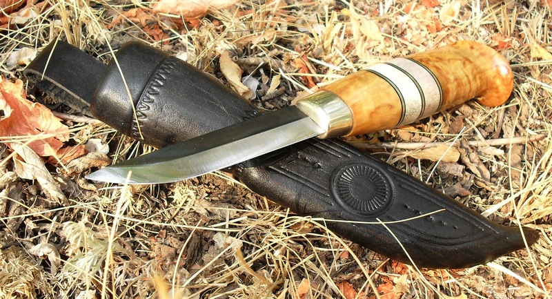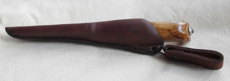 Рукоять- карелка, нейзильбер, рог лося, кожа. Монтаж на эпоксу сквозной с расклёпом . Пропитка маслом для полков и с-шеллак. размеры 115х31х23