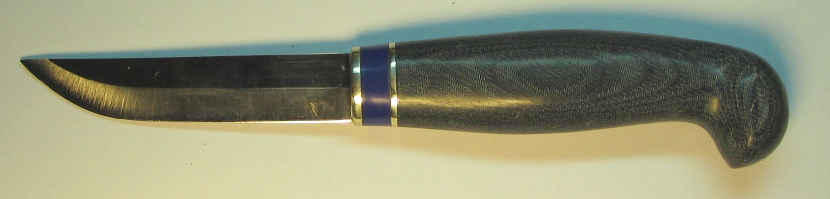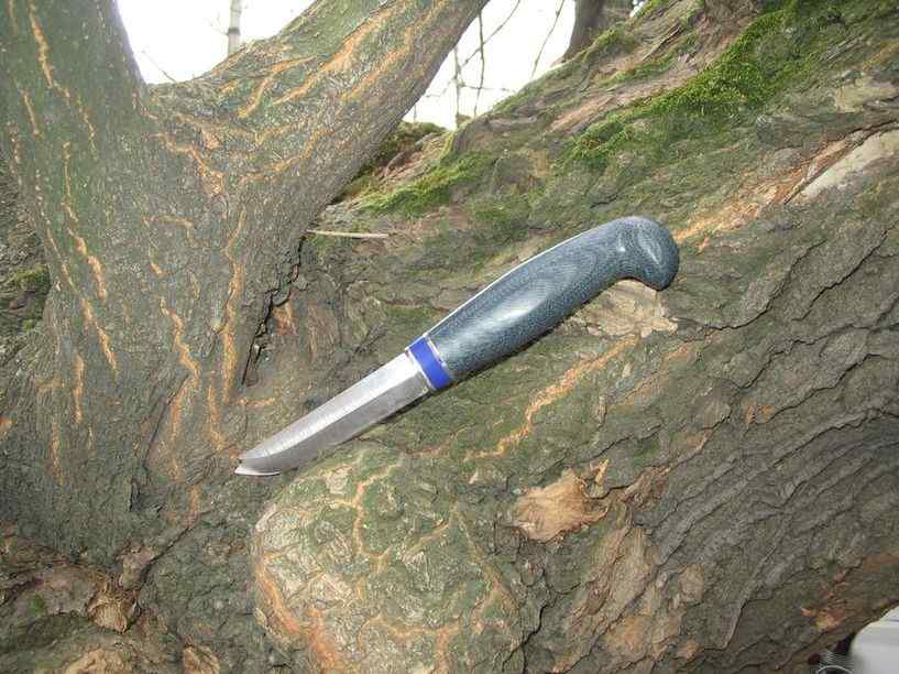 Я еще не делал ножикофф с клинком Лаури. И вот решил восполнить пробел - одеть клинок в самопальную микарту. Нарезал джинсы полосками. Но не стал наматывать их, а действовал испытанным способом - сложил стопкой. Получилось 32 слоя. Намазал, сжал и когда проклеилось осталось только убрать лишнее. Получилась финочка не боящаяся воды. :)
