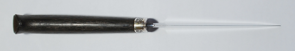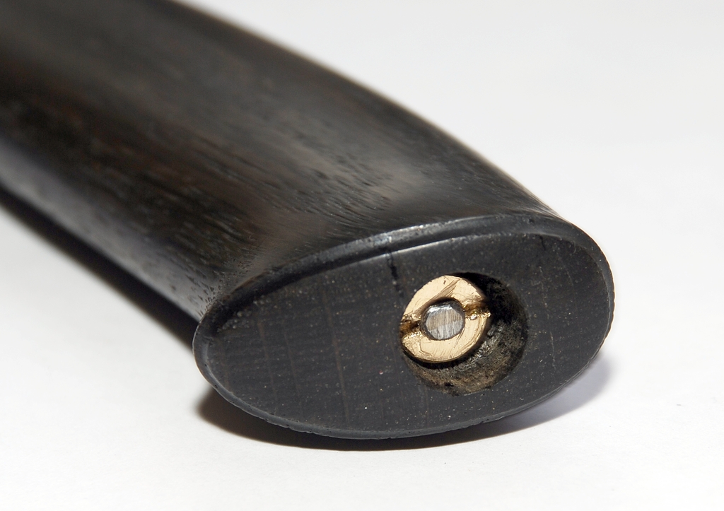 Рукоять: 123мм, морёный дуб, пропитан льняной олифой, мельхиор, кольцо (сказали, что мельхиор, оказалась латунь (предположительно посеребрённая)).