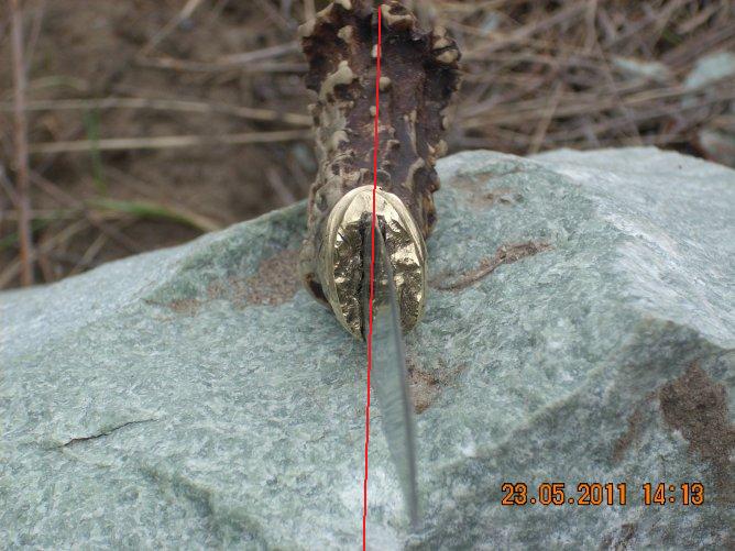 полностью солидарен, либо надо стачивать бока у рога, убирая фактуру верхнего слоя, хотябы частично....по табуреткам,..... так это, чего он такой косой? ...., всмысле вид сверху, продолжение линии обуха клинка. :? Как минимум можно было осевую у рога найти.