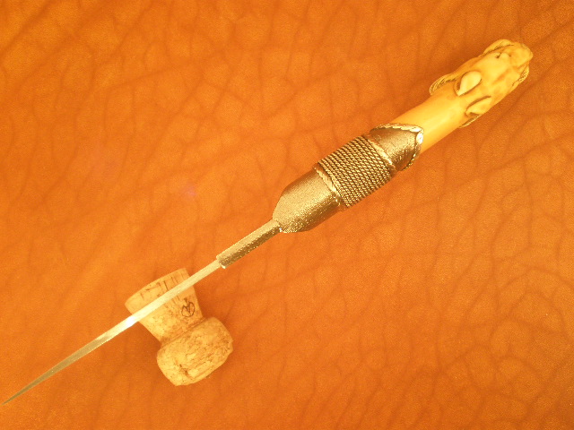 Более полугода назад принес мне наш уважаемый сопалатник старую рукоять от трости, слоновая кость, и попросил что-нибудь ножевое сваять. Долго я не решался, форма рукояти смущала, да еще и трещинки. Наконец вроде выкристаллизовалась идейка, и начал я ее воплощать. Так как трещинки меня несколько напугали, решил оковку сделать подлиннее.