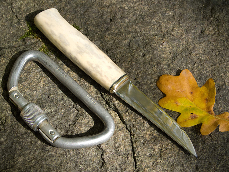 Больший: 40Х13, рог лося, латунь, кожа. Односторонняя заточка.