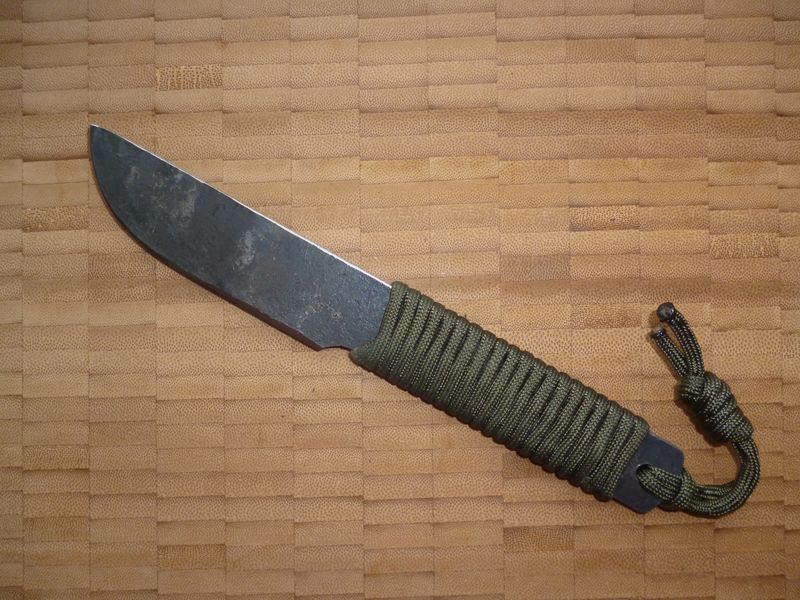 40Х13 отковал, закалил, отслесарил, отшлифовал, заточил, вместо ручки намотал паракорд и сшил из кожи ножны. Окалину оставил, справа отслесарил плоский спуск под 10 градусов, а слева сделал подвод (заточил) под 20 градусов, на конце рукояти просверлил отверстие под темляк и из паракорда сделал темляк.