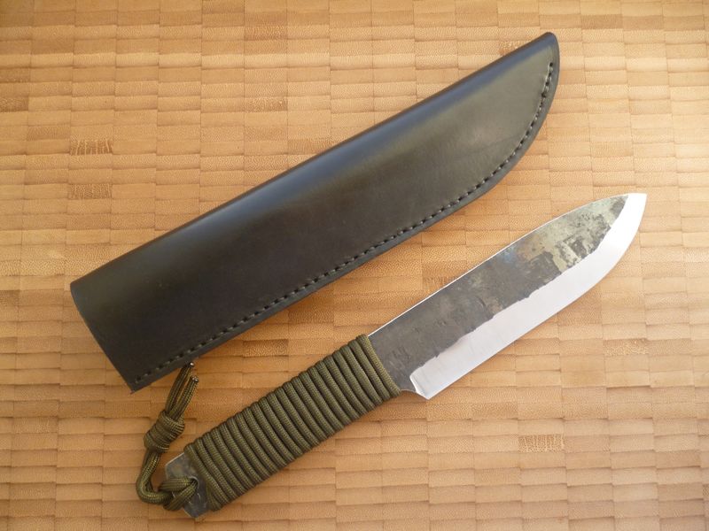 40Х13 отковал, отслесарил, оттермичел, отшлифовал, заточил, намотал перакорд и пошил из кожи ножны. Справа плоский спуск под 10 градусов, слева подвод под 20 градусов.