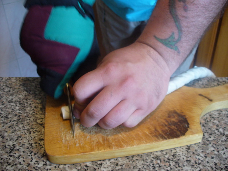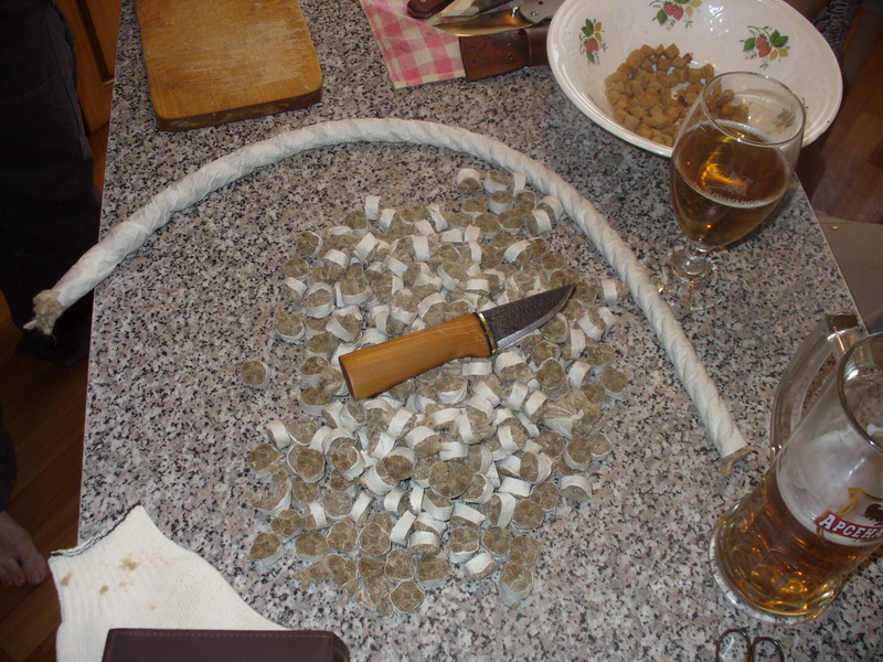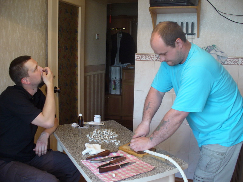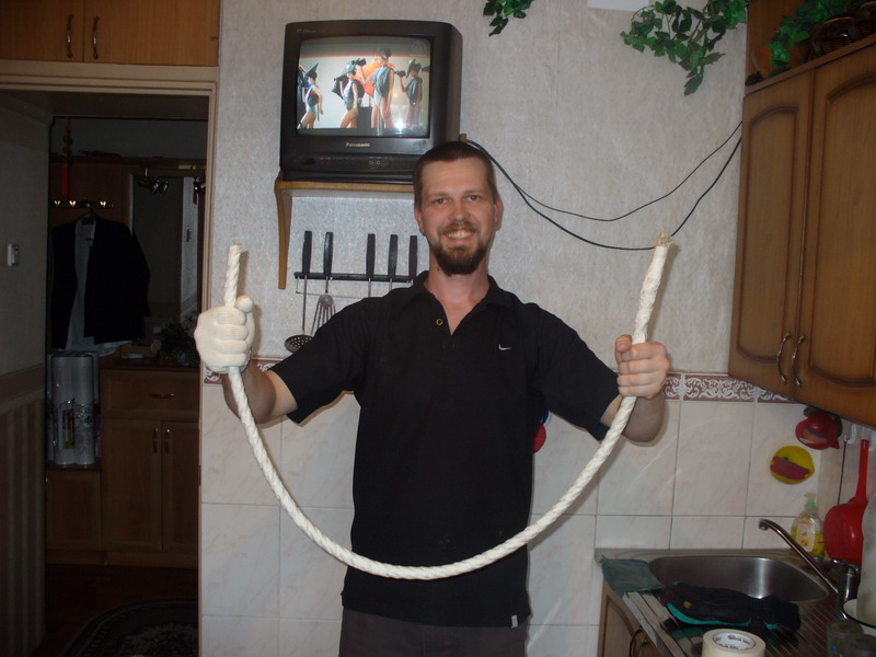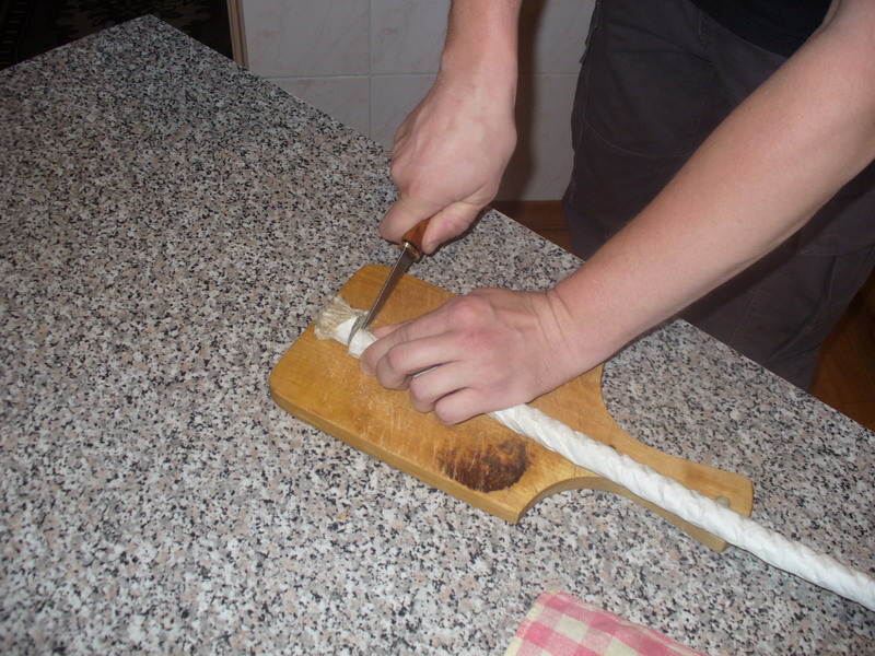 Острота и износостойкость для настоящего скинера – это самое главное, поэтому я решил провести тест на рез каната. Достал пеньковый канат, толщиной 20 мм, французского производства, аж целых три метра, малярный скотч, разделочную доску, перчатки и припёрся к Алексею ( Samodelkin8) в гости. Спасибо ему большое, и его семье, за то что приютили, за фотосъёмку, за пиво, да за всё…