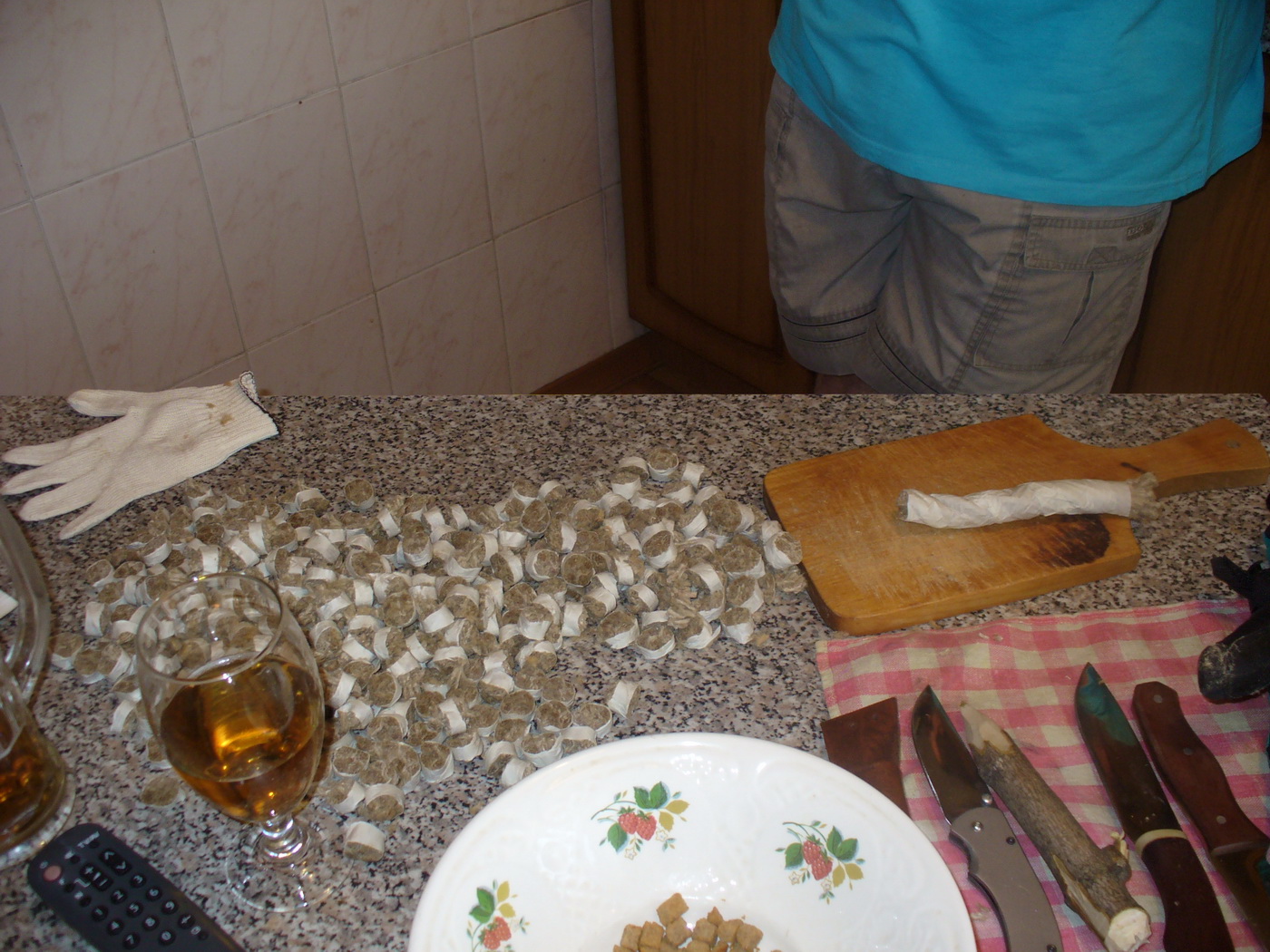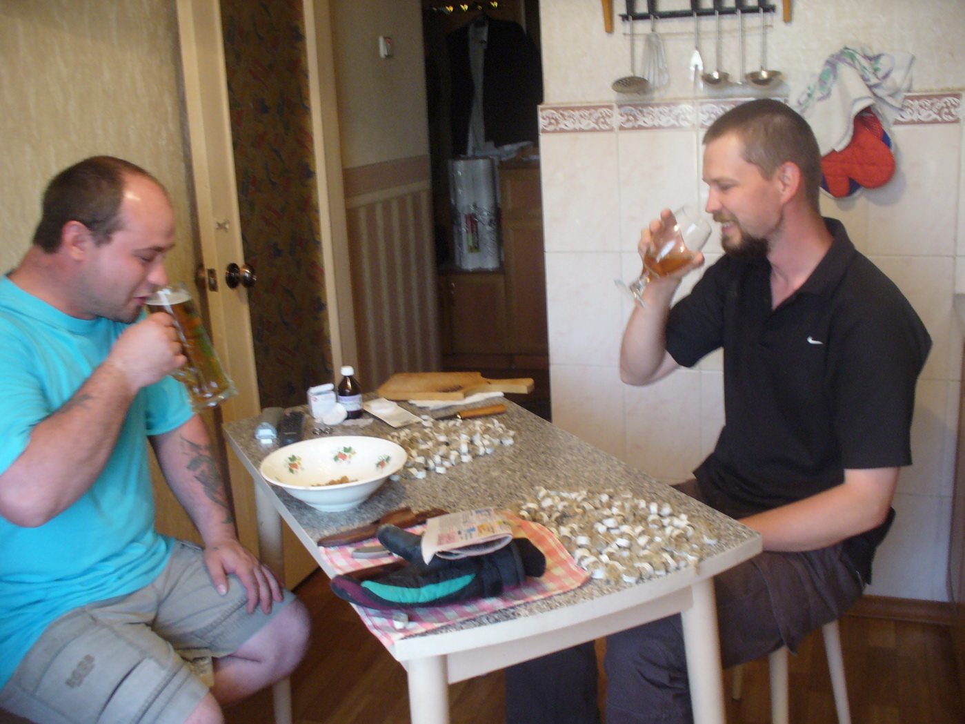 Нож очень даже красивый. Про ручку Дима уже сказал. Мне она маловата, я бы сделал потолще. А так вобщем нож получился классный. Кстати, был сделан не 350, а 351 (о как) рез. И выпито 5 литров пива.