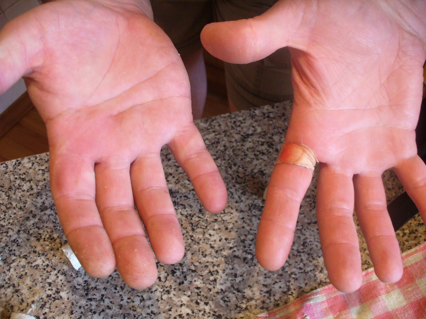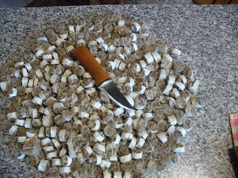 Первоначально, клинком ножа можно было брить волосы на руках – ногах и резать на вису газету. Первым канат резал я, резал без перчаток, рукоять удобная. Потом резал Алексей, и тоже без перчаток. Сразу сказал, что рукоять для него неудобна. Попробовал в рабочих перчатках, но рукоять ножа в них скользила. Тогда Лёша принёс лыжные перчатки и попробовал резать в них. Снова не понравилось, и он смирился с неудобной для него рукоятью. Через двадцать минут сделали первый перерыв. Волосы клинок уже не брил, но газету на вису резал. Снова по очереди резали. Второй перерыв сделали через час после начала испытаний. В промежутке между первым и вторым перерывом, я натёр себе мозоль на первой фаланге указательного пальца. Спасибо Лёшиной любимой за оказание первой медицинской помощи. Дальше в основном резал Алексей. Я если и резал, то в перчатках. Через полтора часа реза, когда осталось меньше метра превосходного французского каната, стали появляться мысли, что канат закончиться, а нож будет продолжать резать. Канат закончился через два часа, после начала теста. Последние кусочки дорезал Лёша. Мне уже даже лыжные перчатки не помогали. Если вначале теста я отрезал кусок каната за три реза, то в конце, за девять. Лёша умудрялся за 6 – 7. Нож естественно уже не резал газету, я уж не говорю про бритьё волос. Итог: за два часа мы порезали трёхметровый канат. Всего было произведено 350 резов. Рк клинка ножа садилась постепенно. Канат закончился, а нож нет…