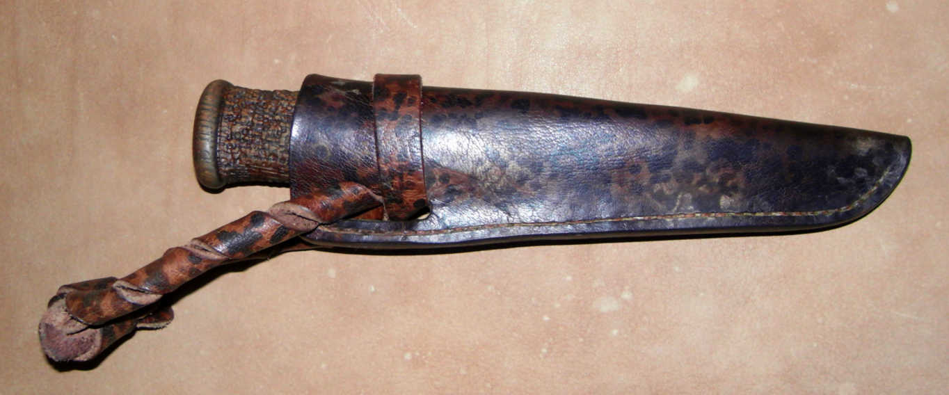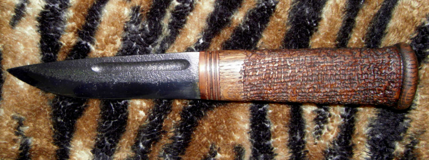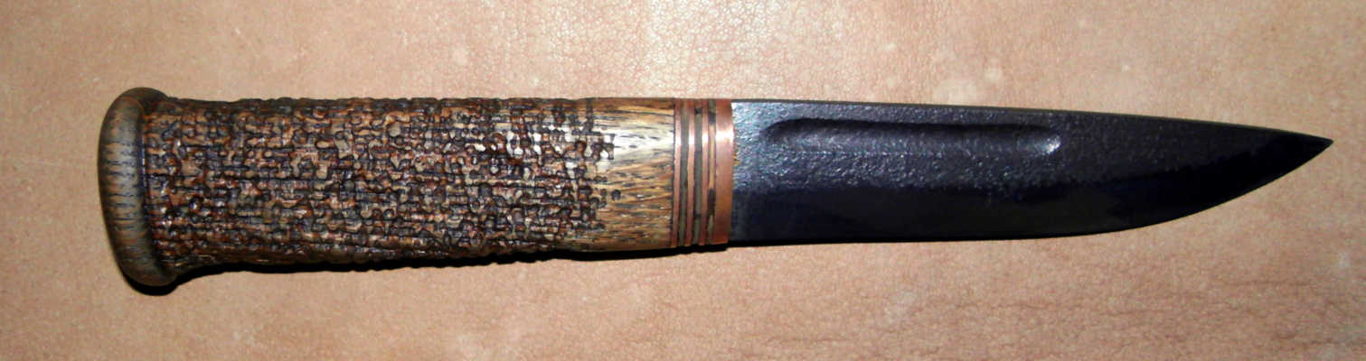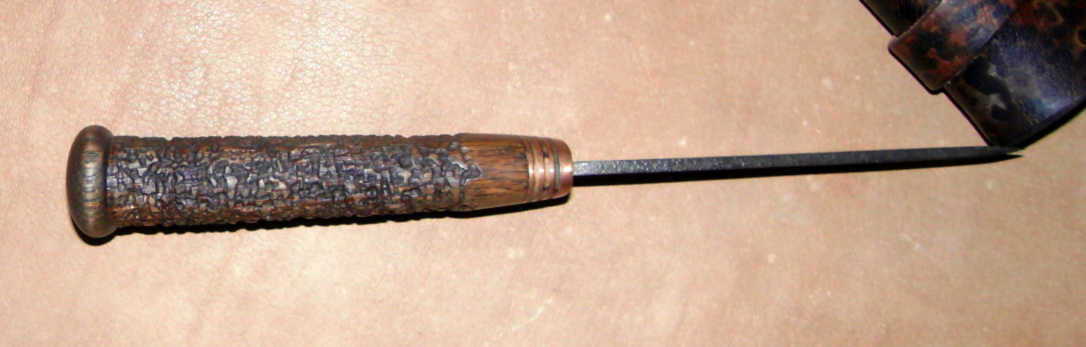 Материалы рукояти самые что ни на есть народные: дуб, медь, береста; никаких нейзильберов-микарт. Клинок отслесарен из лезвия для электрорубанка и протравлен в ХЖ под старину. Рукоять рустицирована сперва гравировальной машинкой, потом, вручную - карщеткой, пропитана морилкой и карнаубским воском. Ножны - чепрак 5мм, подвес с одновременной "утяжкой" - чтобы не вывалился ненароком, покуда разбойный люд шарится по буеракам Кожа крашена марганцовкой, покрыта воском и подвергнута различным ухищрениям для придания бывалого вида.