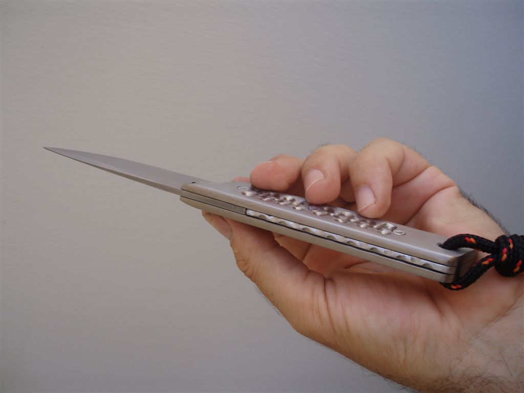 А здорово получается только болты бы и в правду убрать. Что касается кожи ската и прочего, ну не знаю надо ли. вся фишка как раз в том что тита должен быть виден. Так что думаю надо просто ставить клепки и полирнуть ручку... Да под темляк бы дырочку просверлить по мне она просто проситься...