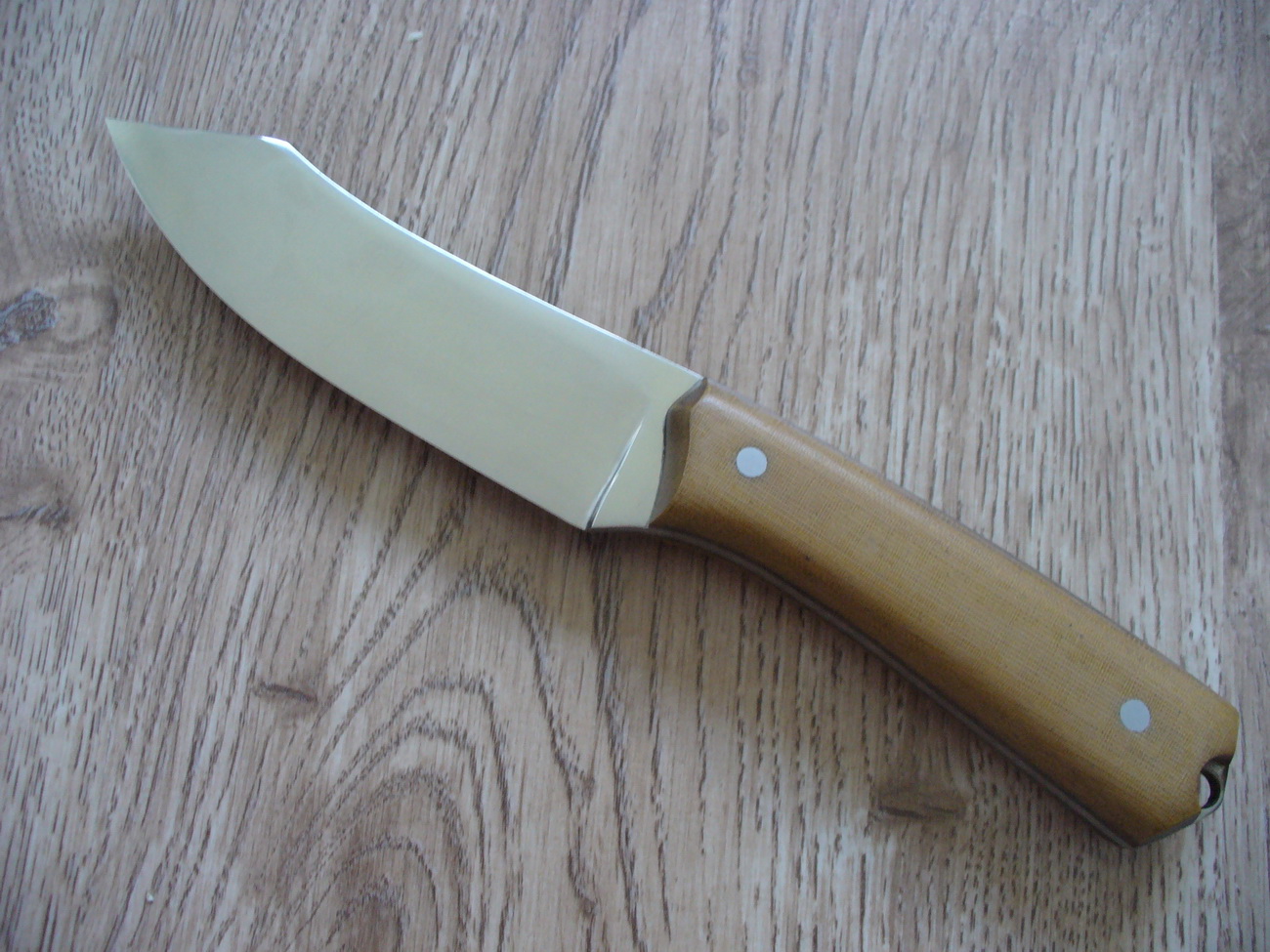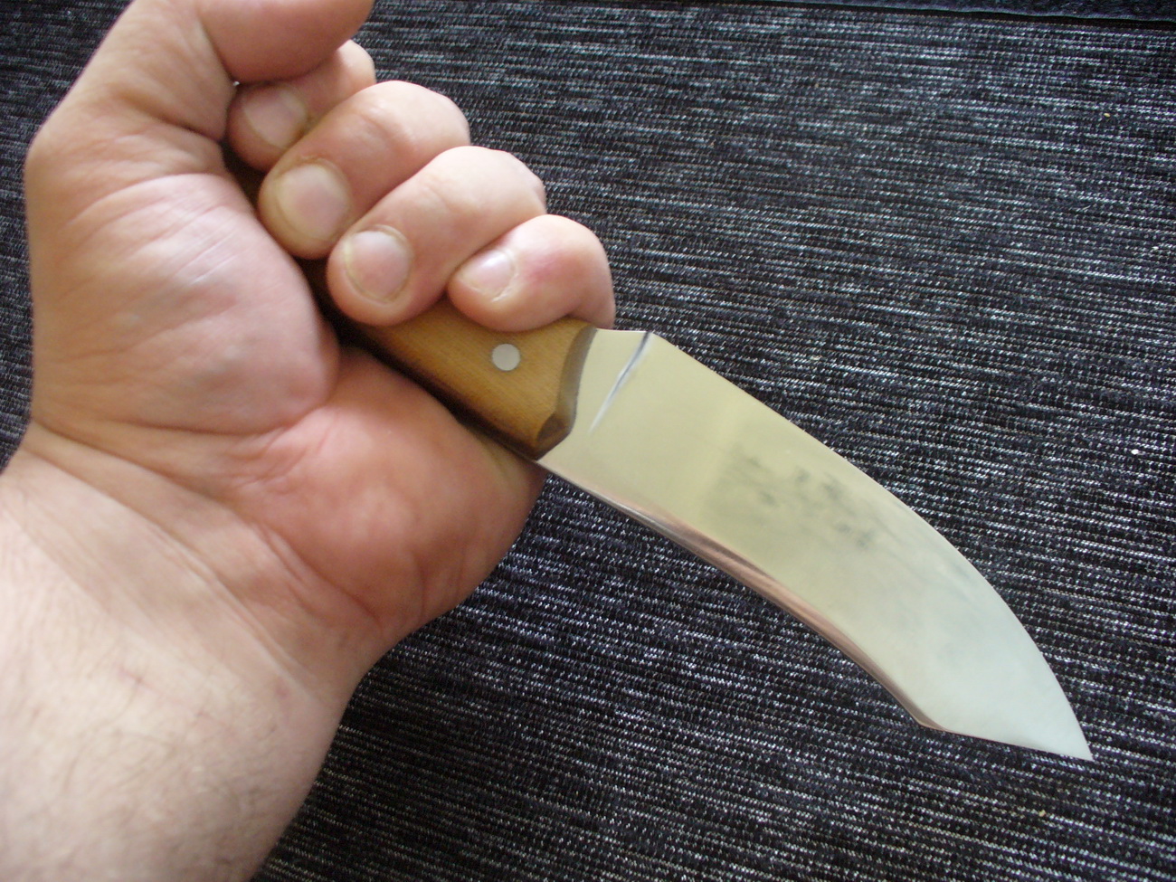 Очень приятный нож. Люблю широкие и кривые. Больстер бы не помешал, на мой взгляд.