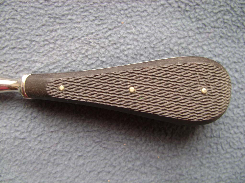 Ну и из истории. Во времена, когда "Грыжесеки" ( ) мыли руки не до, а после операции, хирургический инструмент делали с деревянными накладками.Чисто накладной монтаж. Интересно, как сделан клин на хвостовике.