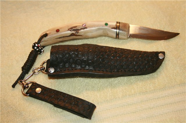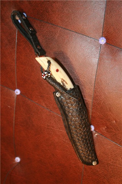 Хорошая работа видно как мастер старался. То что стразы не в тему согласен. Вид именно зуба (хотя лезвие с надписью производители зря сделали). А на зубе камушки не в тему. Хотя как сувенир (корторый при этом еще и резет очень). Ножны тоже хорошо сделаны. Вобщем мое мнение все очень гармонично кроме страз (просто не люблю когда ножи как новогодняя елка, да и на лезвии когда хохлома тоже).