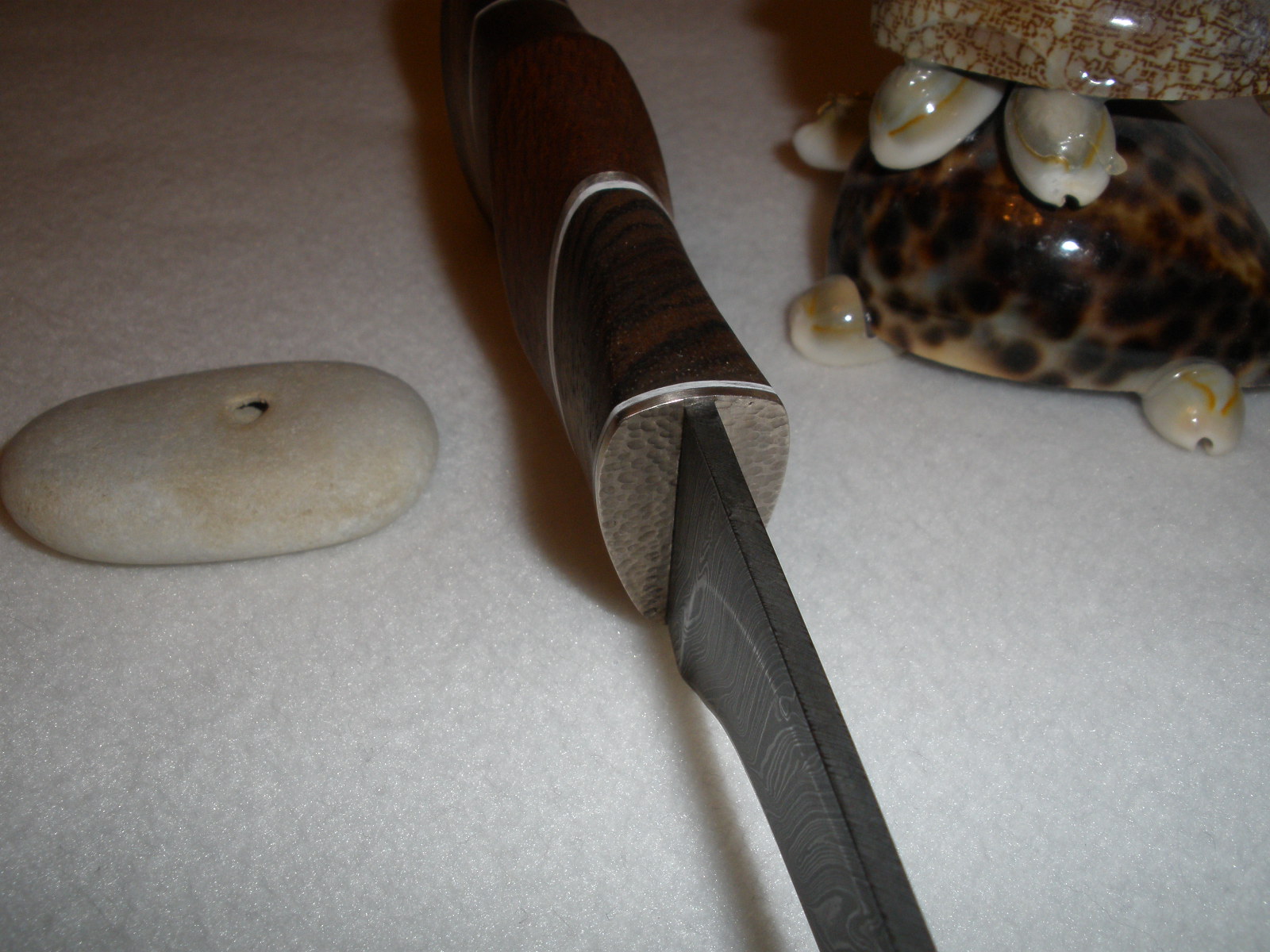Как-то появилась у меня железочка ворсменская,от ,,Кустарей,, Переточил её под специфичную форму,и выбрав время одел ея в дровишки.Вот как-то так всё и было:длина общая-240 Клинок 130*2*30 ,фальшлезвие 65,клин сведён до 0,5 Рукоять-мельхиор-карточки-зебрано-лайсвуд-зебрано.Ножен пока нет ,в поиске.Что получилось - то получилось.Некоторые косяки видны даже слепому , типа заточка РК,но пока навыка работы с вогнутостями немного-учусь,на собственных ошибках.