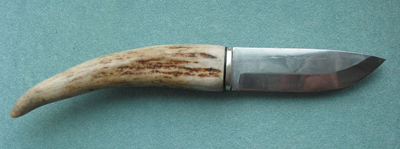 Я бы предложил Вам попробовать сделать втыкушку клинка в тонкую часть рога,раструб в этом случае либо залить клеем либо приклеить заглушку.В этом случае рука увереннее держит нож.Кругом ИМХО.