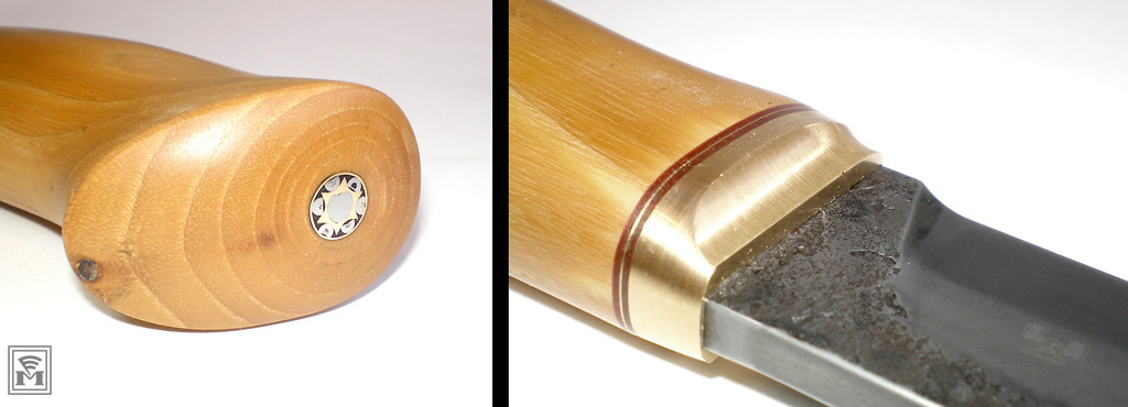 Рукоять: 130, бронза, фибра, unknown wood :) Пропитка: тиковое масло, сверху данишойл. После тикового рукоятка и стала такой, а была чистенькая, розоватая, с четкими прожилками...