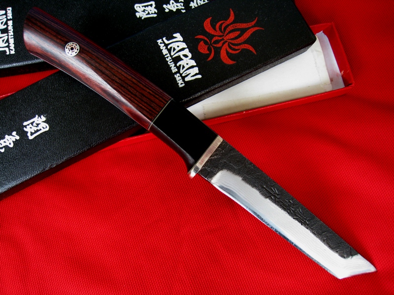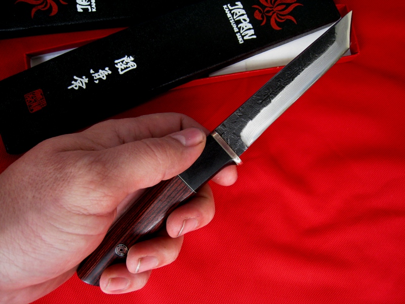Интересный вопрос. Конечно, американский танто, вроде, как и не традиционная форма для японского ножа, так что японцы могут и не знать, какая форма рукояти лучше всего к нему подходит. Нам-то, понятно, наиболее привычна стандартная прямая рукоять... Но переделка данного клинка на всадной монтаж, что бы сделать такую прямую рукоять, не представлялась, к сожалению, возможной. Дело в том, что в хвостовике сделано много довольно больших отверстий - под обмотку шнуром. И все точно по центральной линии - в общем, накладной монтаж практически без вариантов. Да и не такой уж я любитель танто, что бы прилагать подобные усилия только ради исправления ошибки в дизайне, которую этот японский кузнец допустил. :wink: Пусть будет так, нестереотипно, по-японски. :mrgreen: