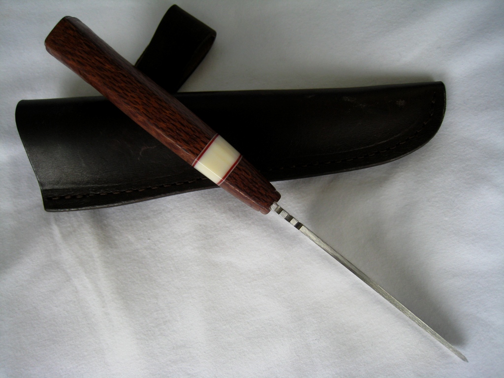 Поскольку некоторые нюансы рукояти меня напрягали, а именно, толщина рукояти в районе проставки из моржа, я нож запихал подальше в ящик и забыл. Но потом меня посетила счастливая мысль: я взял обрезки кости, оценил по ним размеры пустот в использованом мною куске стакана - достал нож и довел-таки рукоять до нужной кондиции, без страха проехать кость и попасть на эпоксидку. Запас-то там был, на самом деле приличный. Ну и заодно само-собой добавились некоторые нюансы. И получилась рукоять в стиле Арт-Деко - что, если подумать, естественно для любого изделия из древесины лайс-вуд. В общем, лучше раз увидеть: