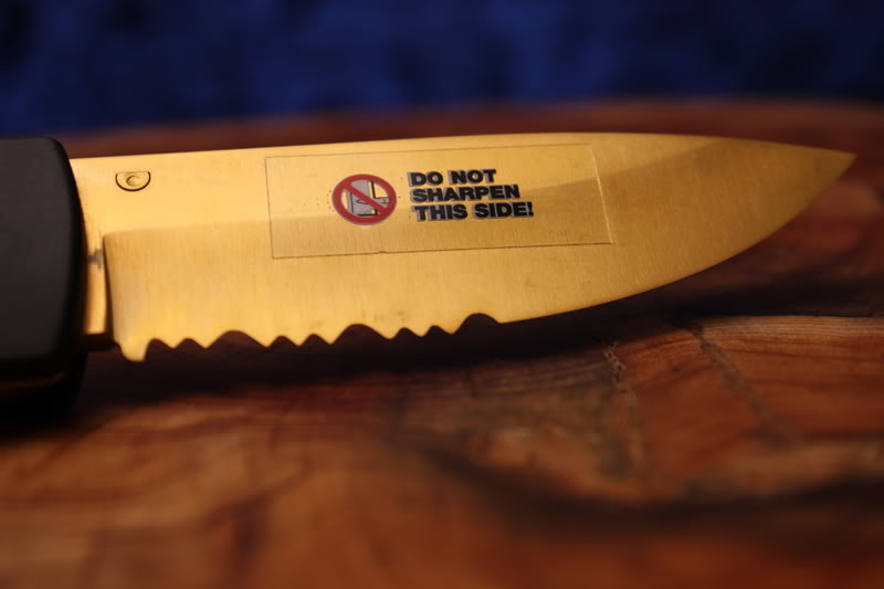 These blades were chisel sharpened to expose the coating on the micro edge. In use , the steel wore away in preference to the coat, making the knives self-sharpening. This geometry (single bevel) is inherently twice as sharp as a double bevel.