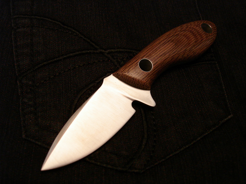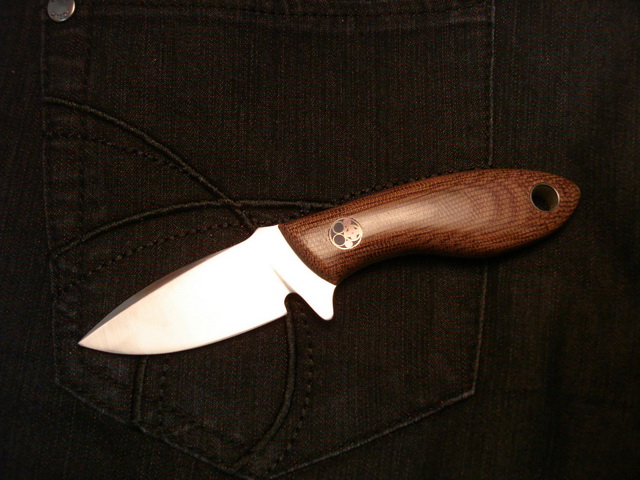 Ну вот брат для предыдущего ножа родился (да простит меня уважаемый Том Крейн за копирование форм его ножей), удобоносимого, так сказать, размера. Сталь углеродка - кусок совпищепромовского поварского ножа, твердость ХЗ (надфиль цепляет но крайне неохотно, сверлил твердосплавным сверлом)