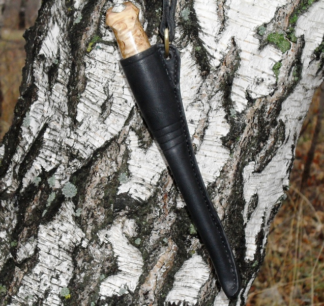 Ножны: кожа 2-3 мм, половинный сосновый вкладыш, латунная проволока. Пропитка ПВА. Пока без воска (не нашёл ещё).