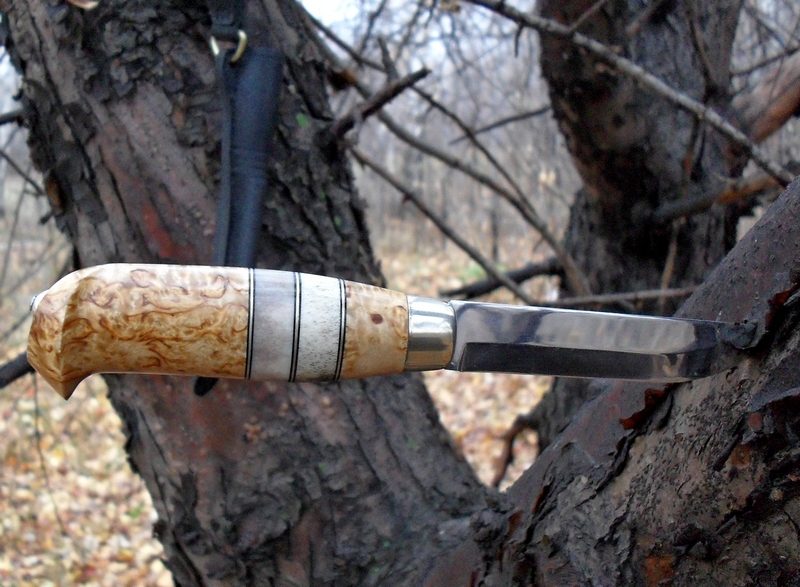 Рукоять 110х28х21: карелка, рог лося, нейзильбер, тонкая кожа, оковка 21х16. Монтаж сквозой на эпоксидку, расклёп.